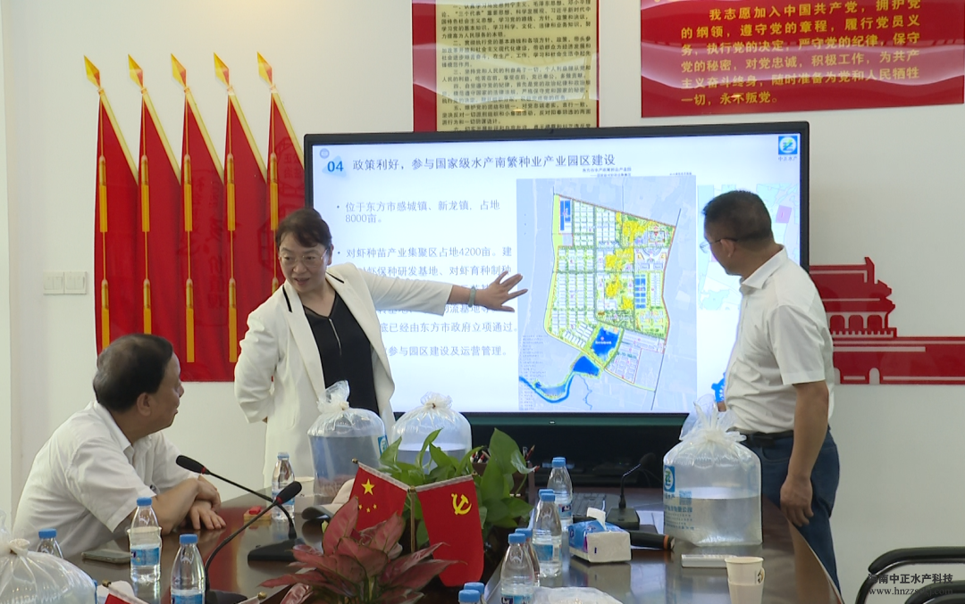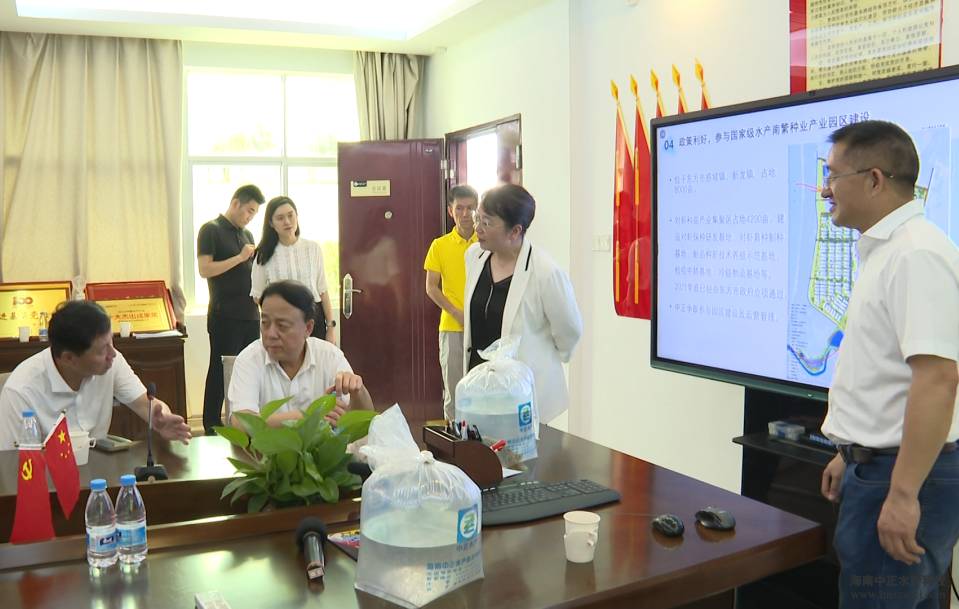 中正水產(chǎn)董事長雷夏雨介紹了公司發(fā)展水產(chǎn)種業(yè)過程中碰到的困難,也闡述提振水產(chǎn)種業(yè)的執(zhí)著信念;東方市市委書記田麗霞介紹了東方水產(chǎn)南繁種業(yè)產(chǎn)業(yè)園的建設進度;中正水產(chǎn)副總裁王平從公司標準化生產(chǎn)、生物安保系統(tǒng)構建、對蝦育種進程等方面,向考察團匯報了公司的發(fā)展歷程以及取得的成果。